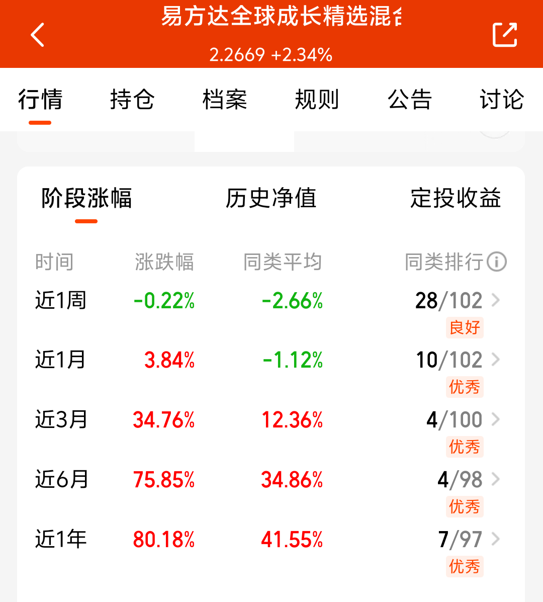 美股昨夜回调了,截止收盘,三大指数小跌,大A和港股今天也调整了,近期市场波动比较大,全球科技板块轮动速度很快,单一市场风险比较大,易方达全球成长精选混合(QDII)人民币C持仓可投全球科技板块,美股、A股和港股都能投,这只还是历史绩优低回撤榜一,能涨抗跌,近三个月涨了34.76%,近六个月涨了75.85%,看好这个方向,我准备分批加仓了!