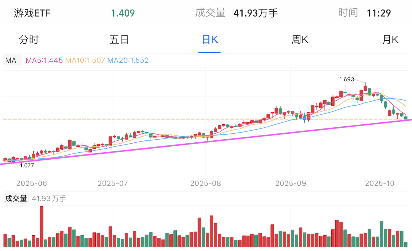 游戏近期一路震荡上行。最近在大幅反弹后力竭下跌,已经跌至中长期上涨趋势线附近,今日似乎跌破,如果无法很快反弹回来,那么进入回调阶段。