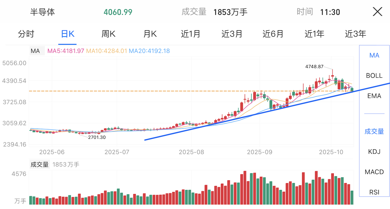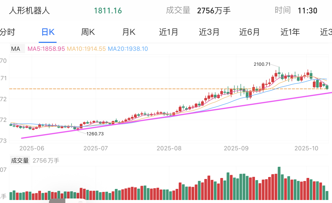 人形机器人和半导体近期一直震荡上行,有一波较大行情。前几日较大幅度下跌,今日继续下行,已经靠近中长期上涨趋势线,能否守住支撑位决定后市走向。