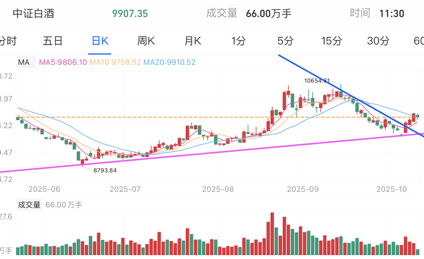 白酒此前在短暂反弹后回落,最近再次反弹,突破下跌趋势线,但交易量依然不高,短期不能确定就此回升,也可能横盘整理。