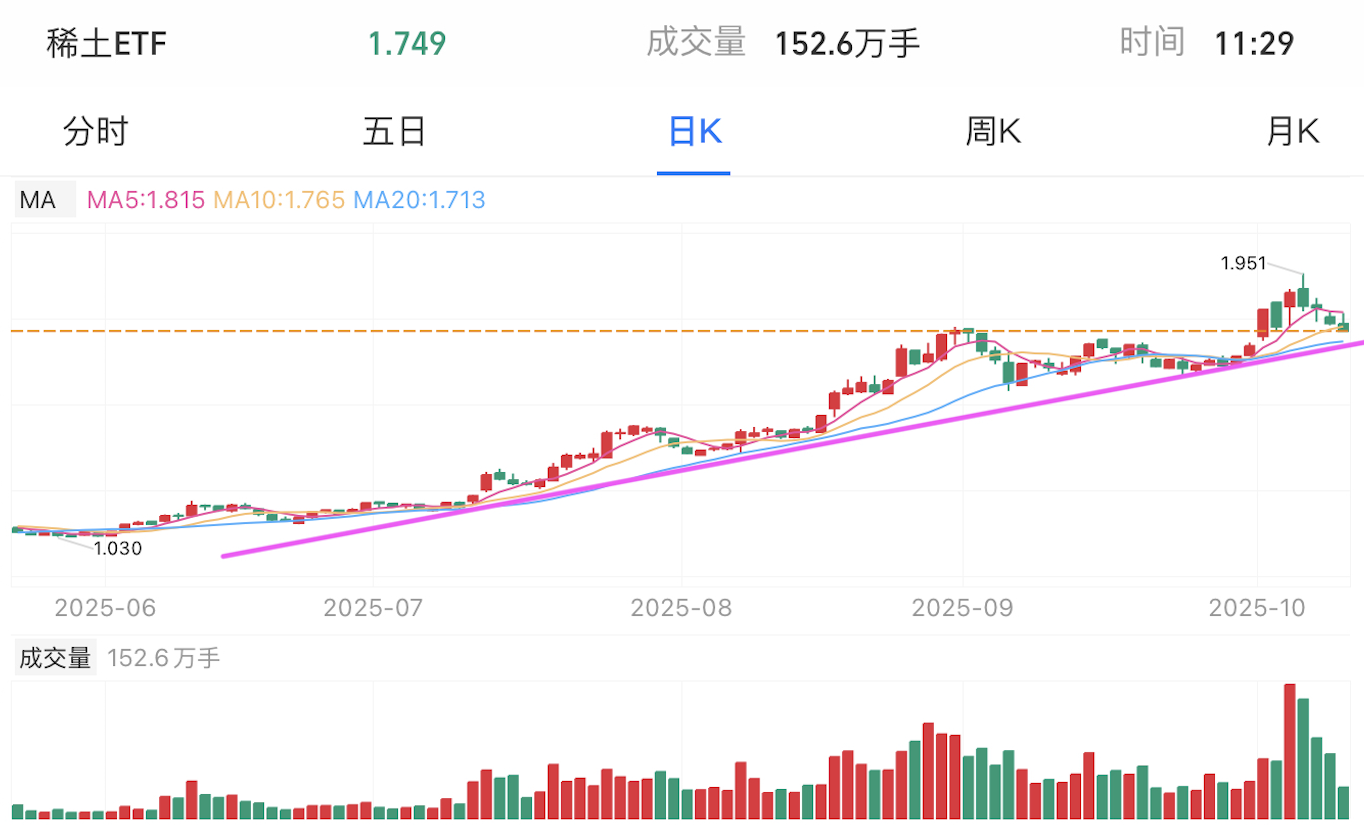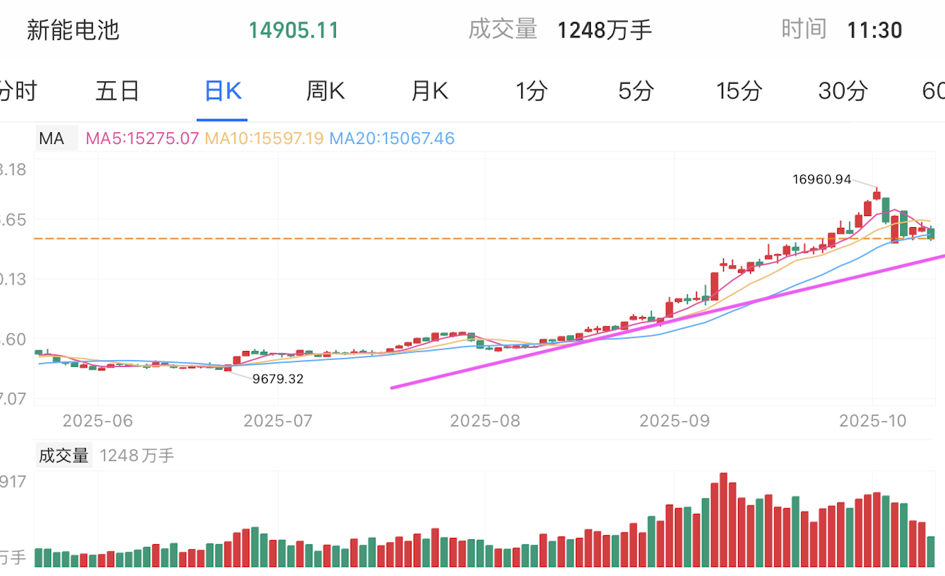 新能电池近期有一波上涨,在大幅拉升后力竭回调,这两日震荡,但最终没有守住支撑,目前再次下行,距离另一中长期上涨趋势线还有下行空间。