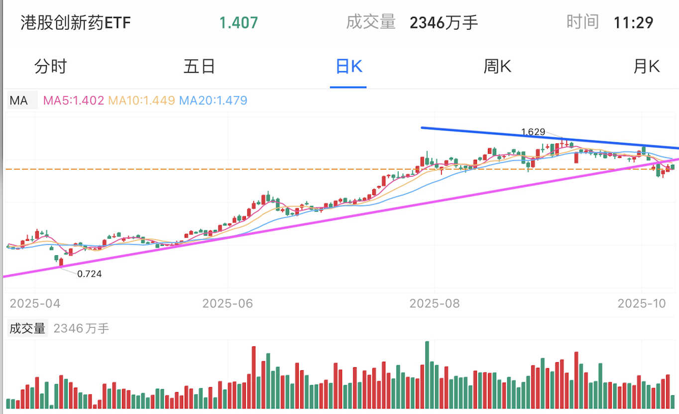 创新药和港股创新药近期大幅上涨,后力竭盘整,这几日跌破中长期上涨趋势线。这几日反弹,有止跌迹象,但没有突破下跌趋势线,也不确定是否下行中的震荡。