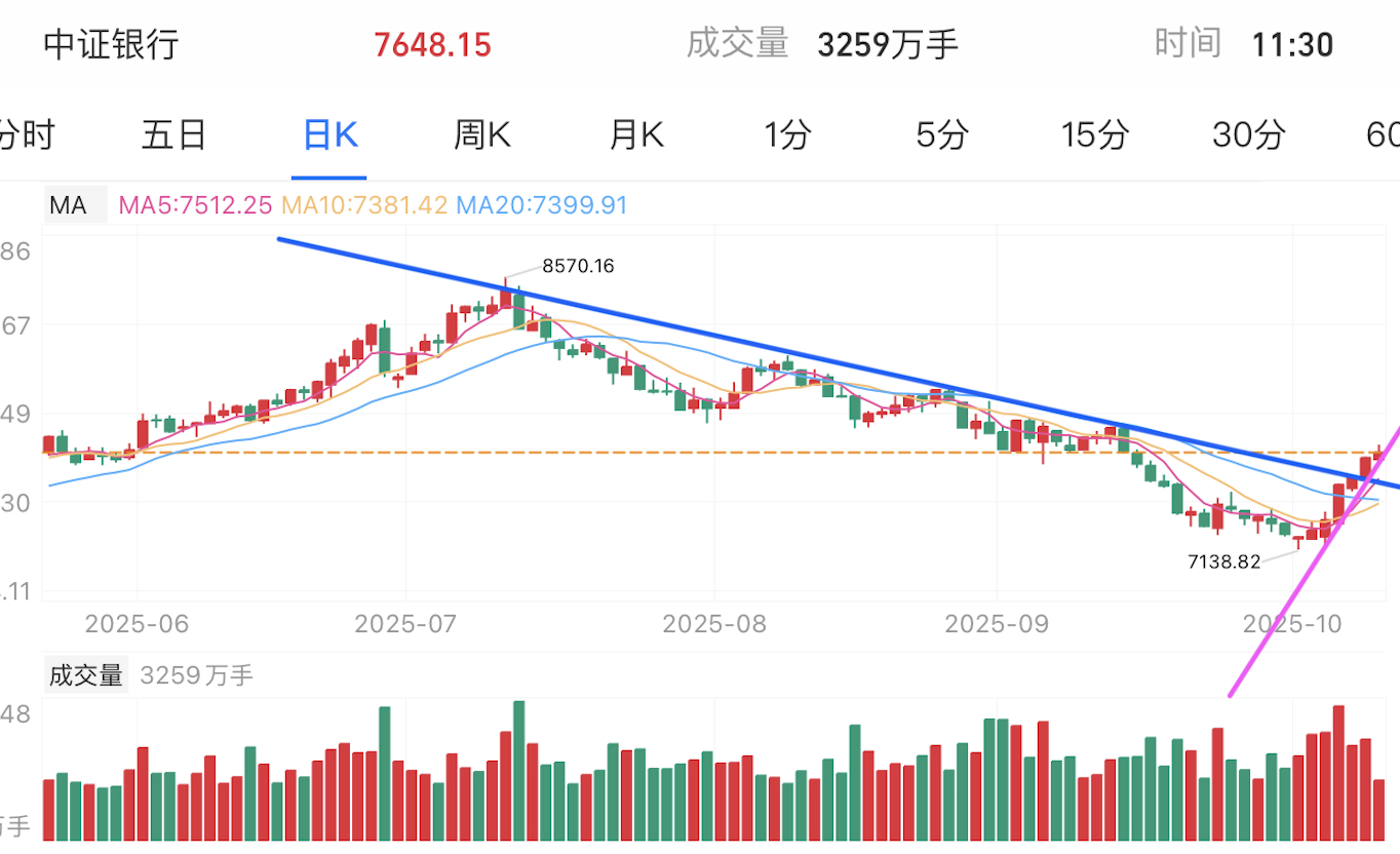 银行近期震荡下行趋势。这几日出现放量上涨,突破下跌趋势线,有回升迹象。上方逼近前高压力位,如果突破,那么确认反转向上。