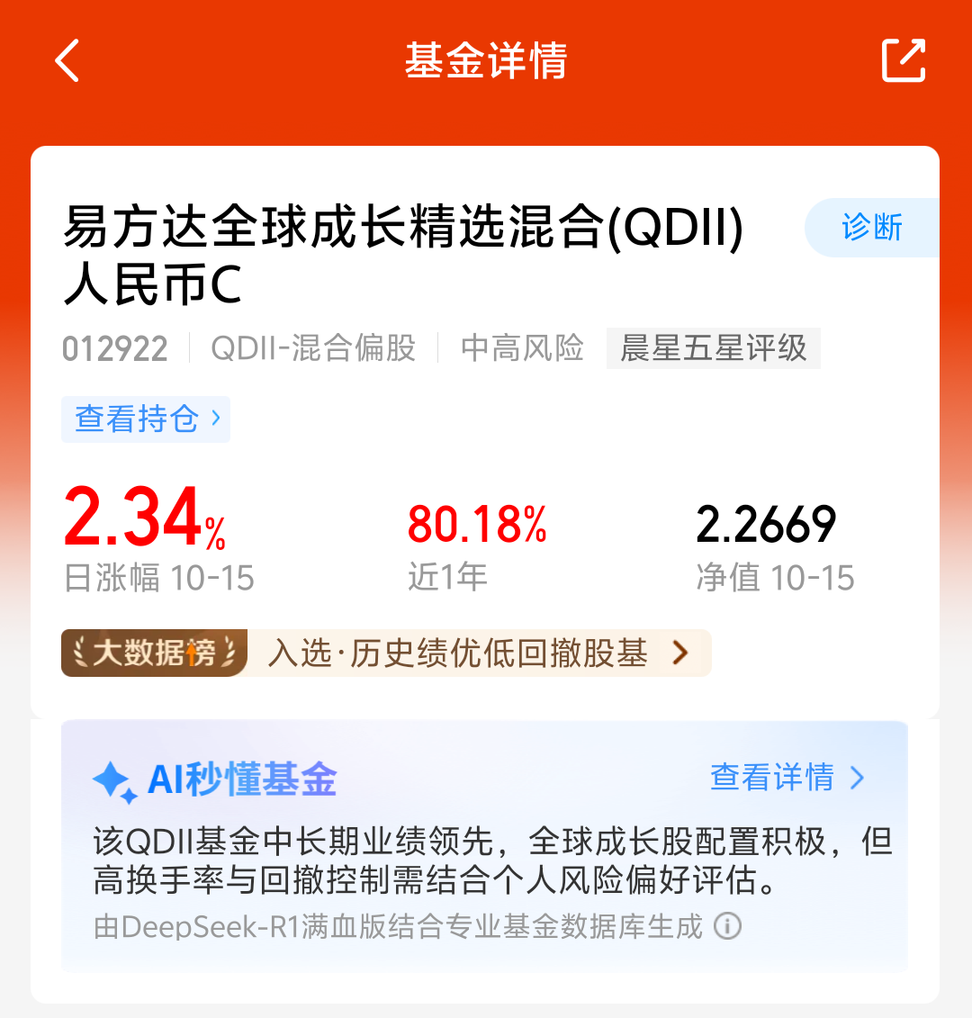 美股昨夜小幅回调,三大指数小跌,大A和港股今天也调整了,大科技板块长期来看仍然是主线,单一市场风险比较大,我准备分批加仓易方达全球成长精选混合C,持仓可投全球科技板块,美股、港股和A股都能投,近一年涨了80.18%,这只还是历史绩优低回撤榜一,回撤控制的很不错,我准备分批上车了!