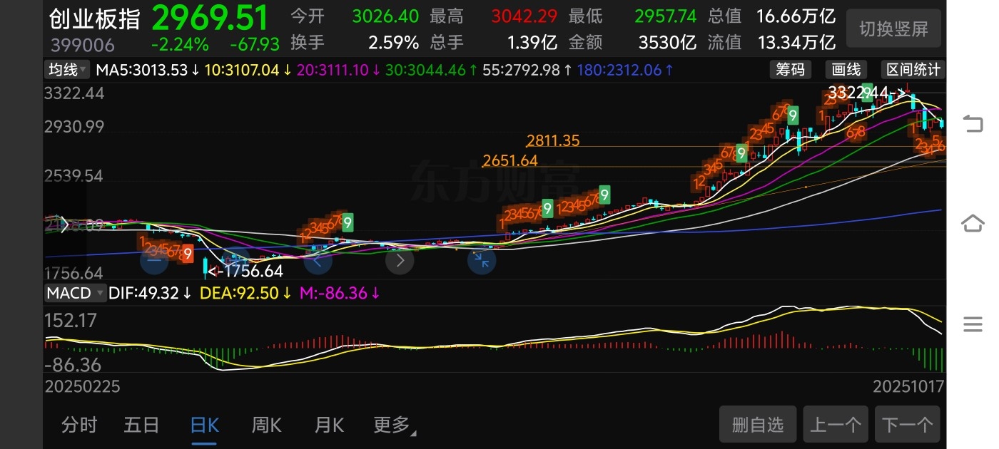 10.9节后第一个交易日,空仓离场(见最后卖出贴图)。目前看上证前两天已形成日线顶背离(不可不重视),创指明显再走ABC调整结构,见贴图。逢反弹减仓为宜。调整结束再做主线品种。(仅为个人操作思路记录)
