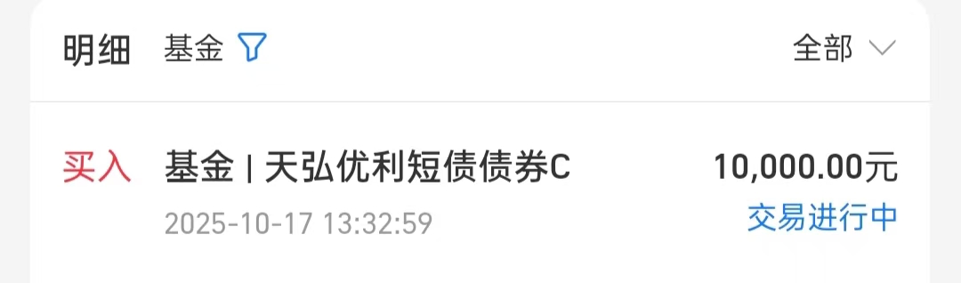 个人今作:大额上车稳健短债基:$天弘优利短债发起C(OTCFUND|014925)$,+10000元