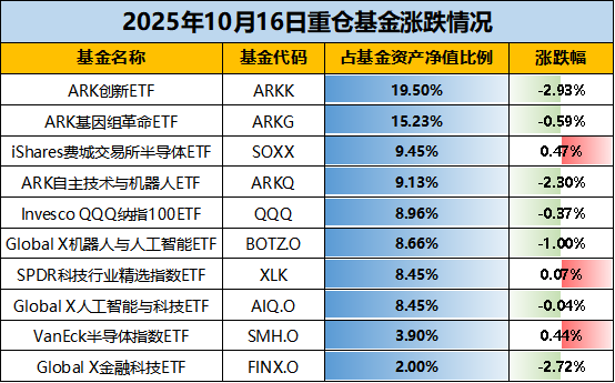 【重仓涨跌】根据基金2025年二季报披露,重仓基金中3只为“木头姐”凯茜伍德旗下聚焦于美股前沿科技的基金,合计占比达43.86%。