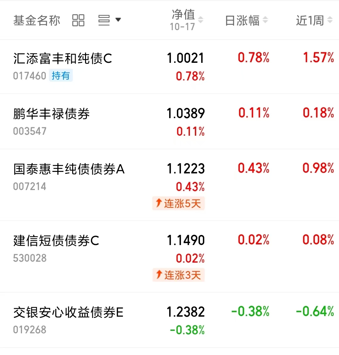 家人们周五咯~今天行情震荡还好有债给到安慰呀~我看$汇添富丰和纯债C(OTCFUND|017460)$今天收涨78个蛋~这里配置的30年超长债,可以说是做波段的好工具呀,而且这里的久期恒定适合咱们做波段,期待后续继续反弹行情~
