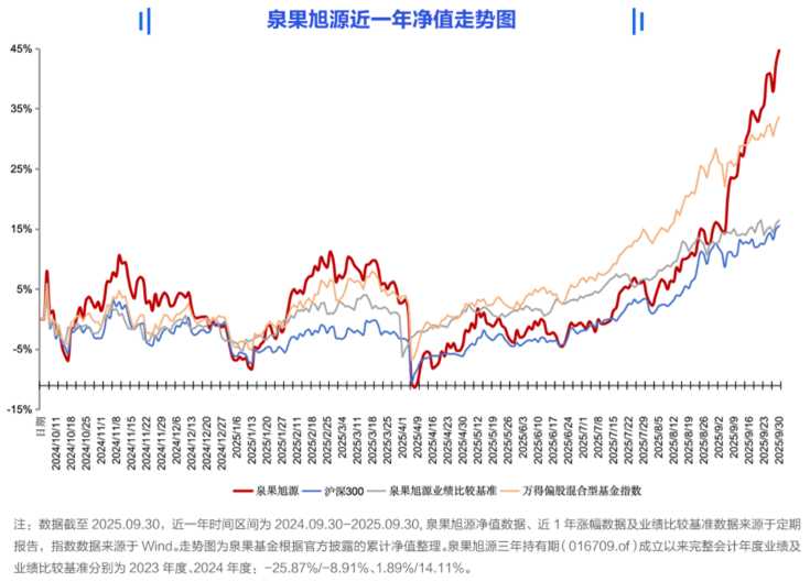 注:“产品近1年涨幅”时间区间为2024.9.30-2025.9.30,数据来源于定期报告。泉果旭源三年持有期(016709.of)成立以来完整会计年度为2023年度、2024年度,其业绩及业绩比较基准分别为:-25.87%/-8.91%、1.89%/14.11%。