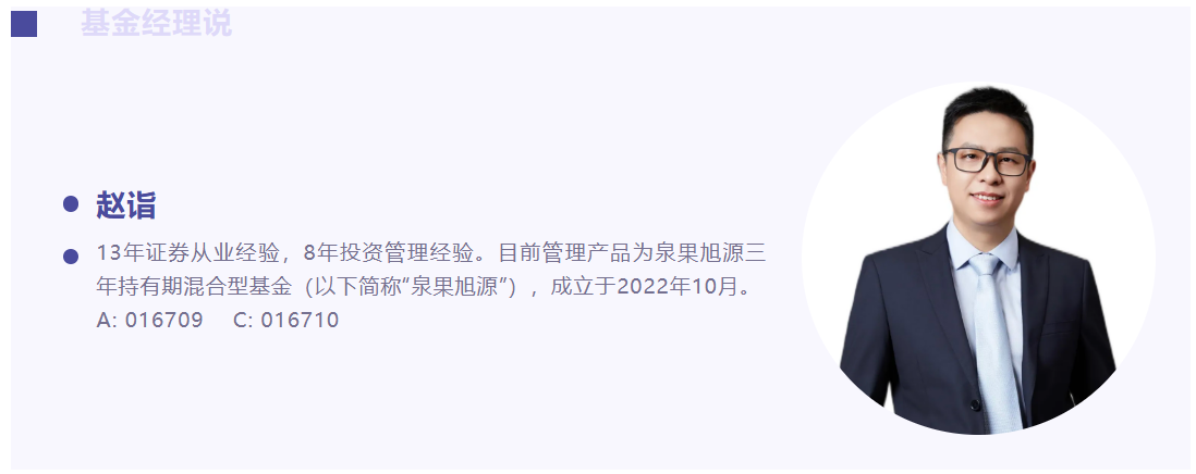 风险提示:本文不代表泉果基金的任何意见或建议,不构成泉果基金对未来的预测。所载信息仅供一般参考,前瞻性陈述具有不确定性风险。本文所涉个股不构成任何推荐。泉果旭源三年持有期混合每份基金份额设3年锁定持有期,锁定期内不可赎回。基金过往业绩不预示未来表现,管理人管理的其他基金业绩不构成本基金业绩的保证。基金有风险,投资需谨慎。泉果旭源三年持有期混合为混合型基金,其预期风险与预期收益高于债券型基金与货币市场基金,低于股票型基金。管理人对本基金的风险评级为R4,在代销机构购买时请以代销机构的风险评级为准,请投资者根据风险承受能力购买风险等级相匹配的产品。基金由泉果基金发行管理,代销机构不承担产品的投资和兑付责任。