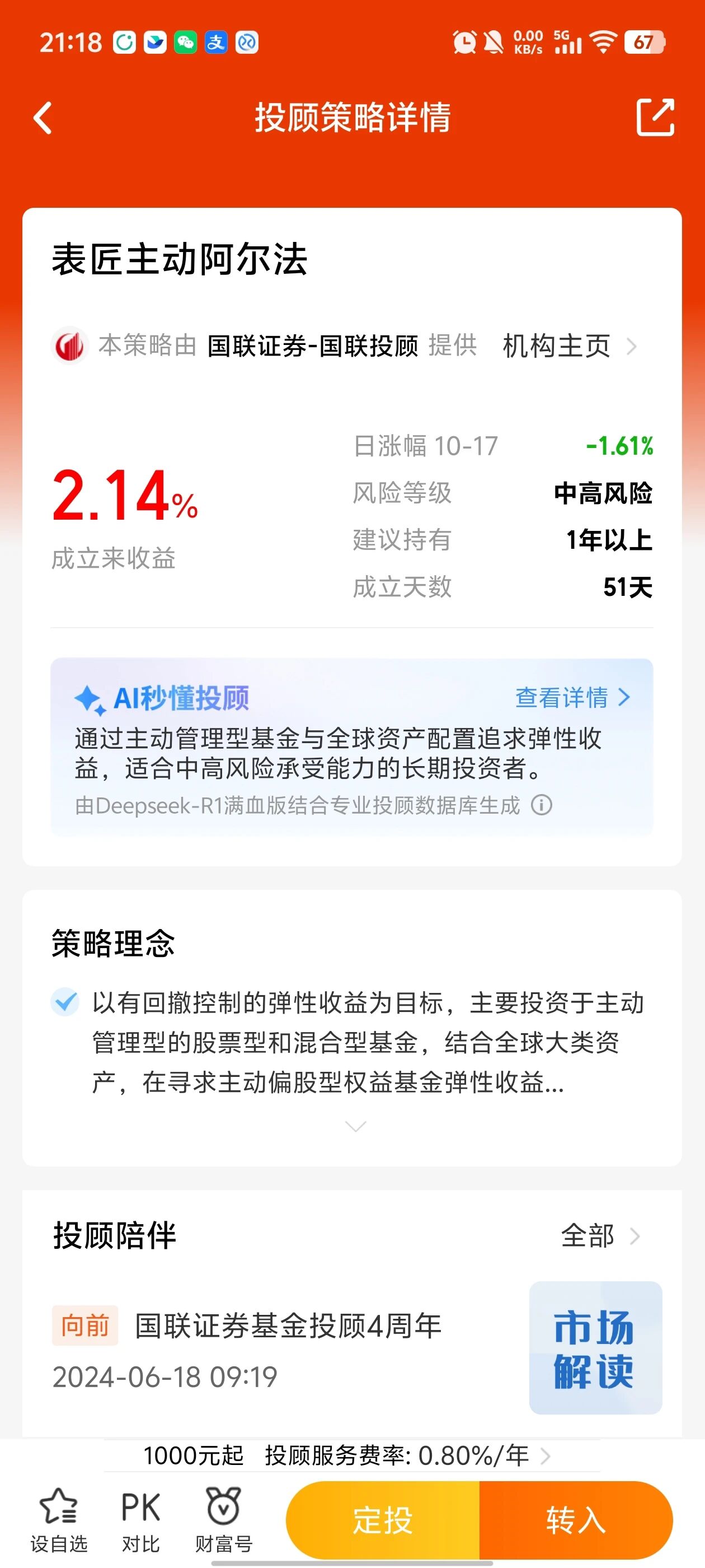 不过从我跟投的表匠主动阿尔法投顾来看,今天的跌幅只有全场的一半。