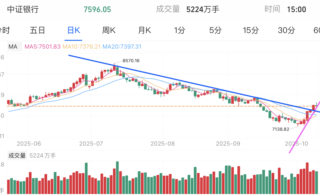 银行近期震荡下行趋势。这几日出现放量上涨,突破下跌趋势线,有回升迹象。上方逼近前高压力位,如果突破,那么确认反转向上,否则也可能进入横盘震荡期。