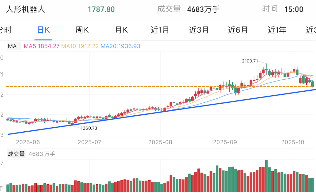通信(CPO)和人形机器人近期有一波大行情,后高位盘整。最近几日连续大幅下跌,跌破短期上行趋势,逐渐靠近中长期上涨趋势线。两者目前还正处在圆弧顶的颈线位,跌破将就此下行。