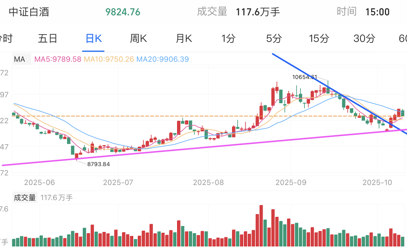 白酒此前在短暂反弹后回落,最近再次反弹,突破下跌趋势线,但交易量依然不高,不能确定就此回升还是横盘整理。