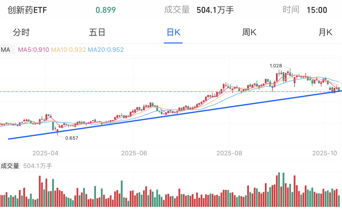 创新药近期大幅上涨,后力竭盘整,这几日跌至中长期上涨趋势线,暂时没有跌破支撑。鉴于港股创新药已经跌破支撑,此板块仍有下行风险。