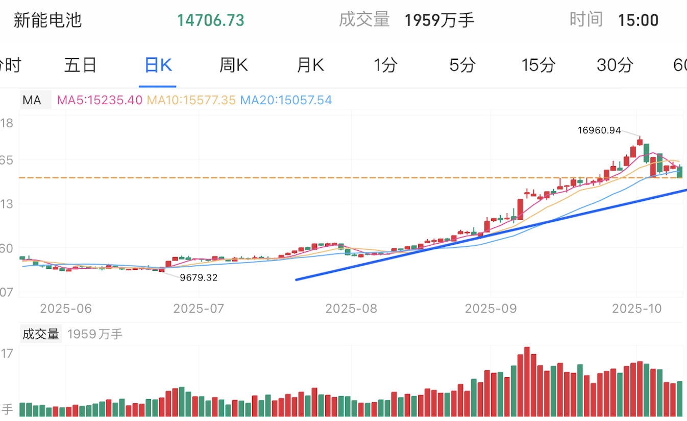 新能电池近期有一波上涨,在大幅拉升后力竭回调,这两日震荡,但最终没有守住支撑,再次下行,下一支撑位在中长期上涨趋势线,短期仍有下行空间。