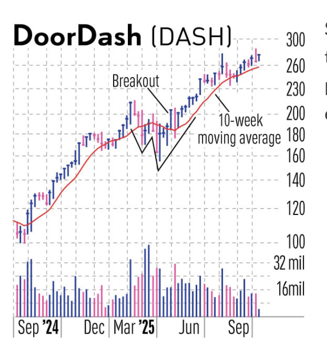 突破发生在5月2日结束的那一周,当时DoorDash突破入场点。尽管突破后DoorDash公布财报导致回落,但这次回落允许股票形成柄部,并提供了一个备选入场点。此后,它轻松持稳,并于8月7日上涨34%至278.15的高点。