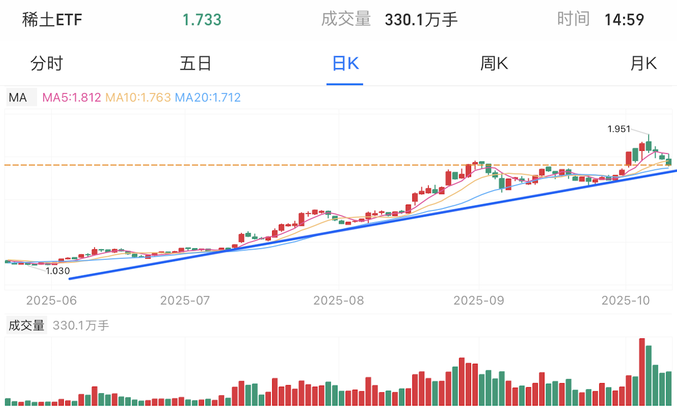 稀土和科创芯片近期一直震荡上行,最近在短期盘整后大幅反弹,突破前高压力位。然而很快回落,目前已经跌至关键上涨趋势线附近,如果无法守住,那么此次行情结束。
