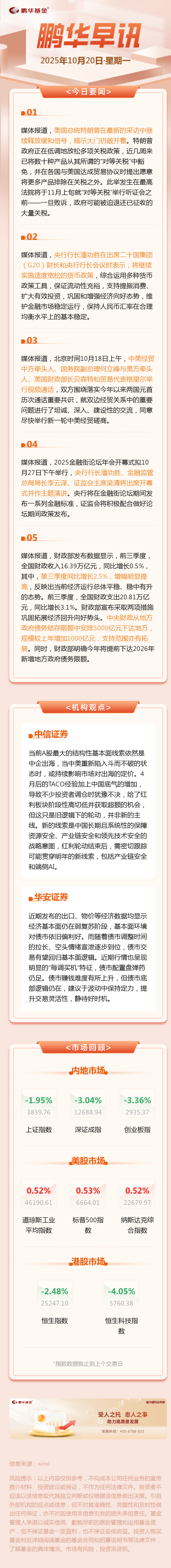 鹏华早讯10.20 美国总统特朗普继续释放缓和信号