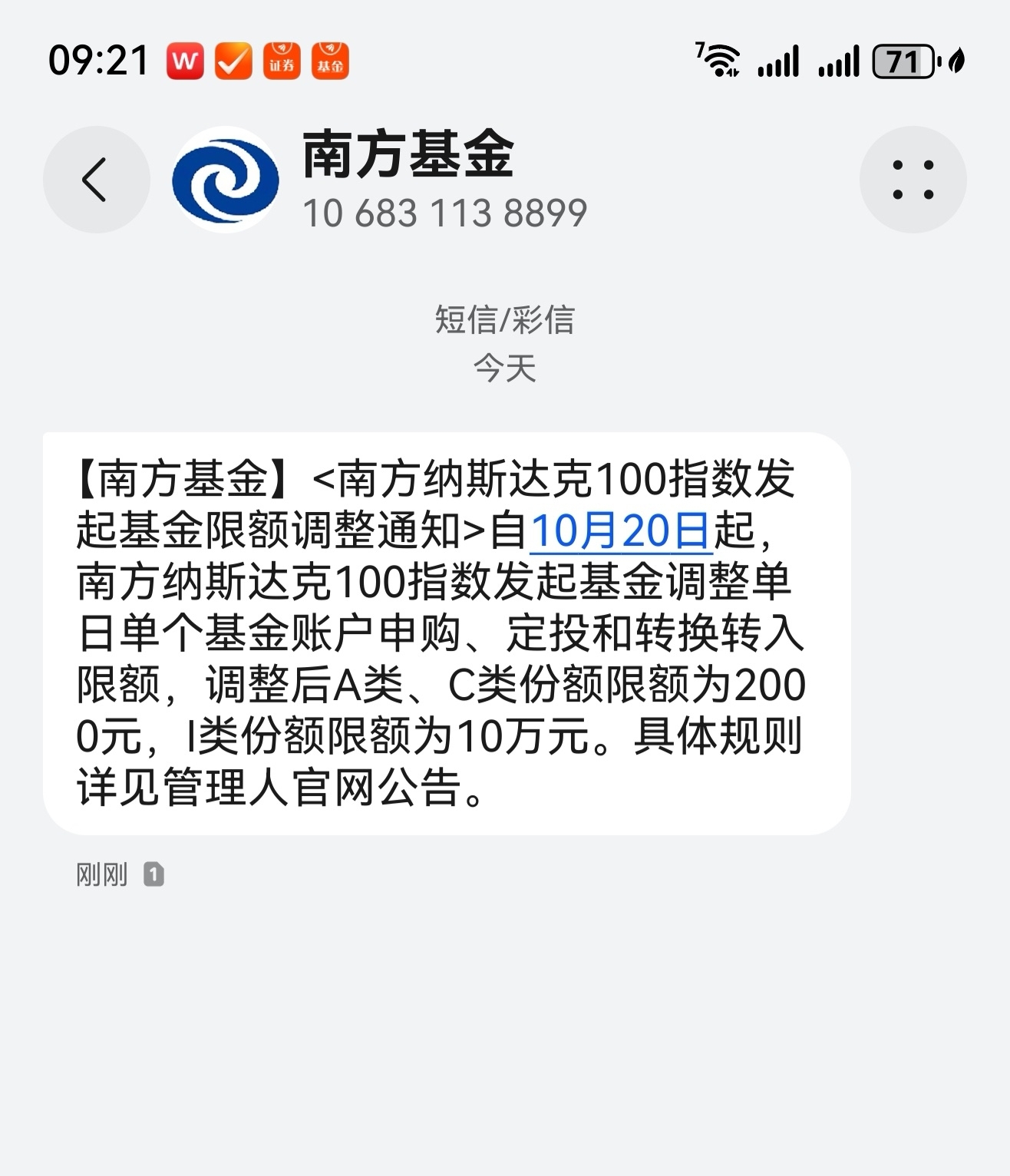 在今天上午的时候,手机收到南方基金发来的信息说纳斯达克100指数基金,从今天天10月20日那天开始,就已经更改成每天限额只能选择买2000元了。