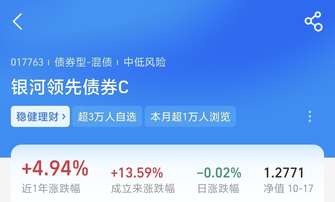 上周五市场迎来全面调整,混债行情未能独善其身调整了,但我认为这并非风险,而是机遇。$银河领先债券C$ 近一年上涨4.94%的成绩还不错,挺稳的,今年我认为性价比相较于纯债基金仍更胜一筹,我对这类固收加的产品的前景保持乐观。