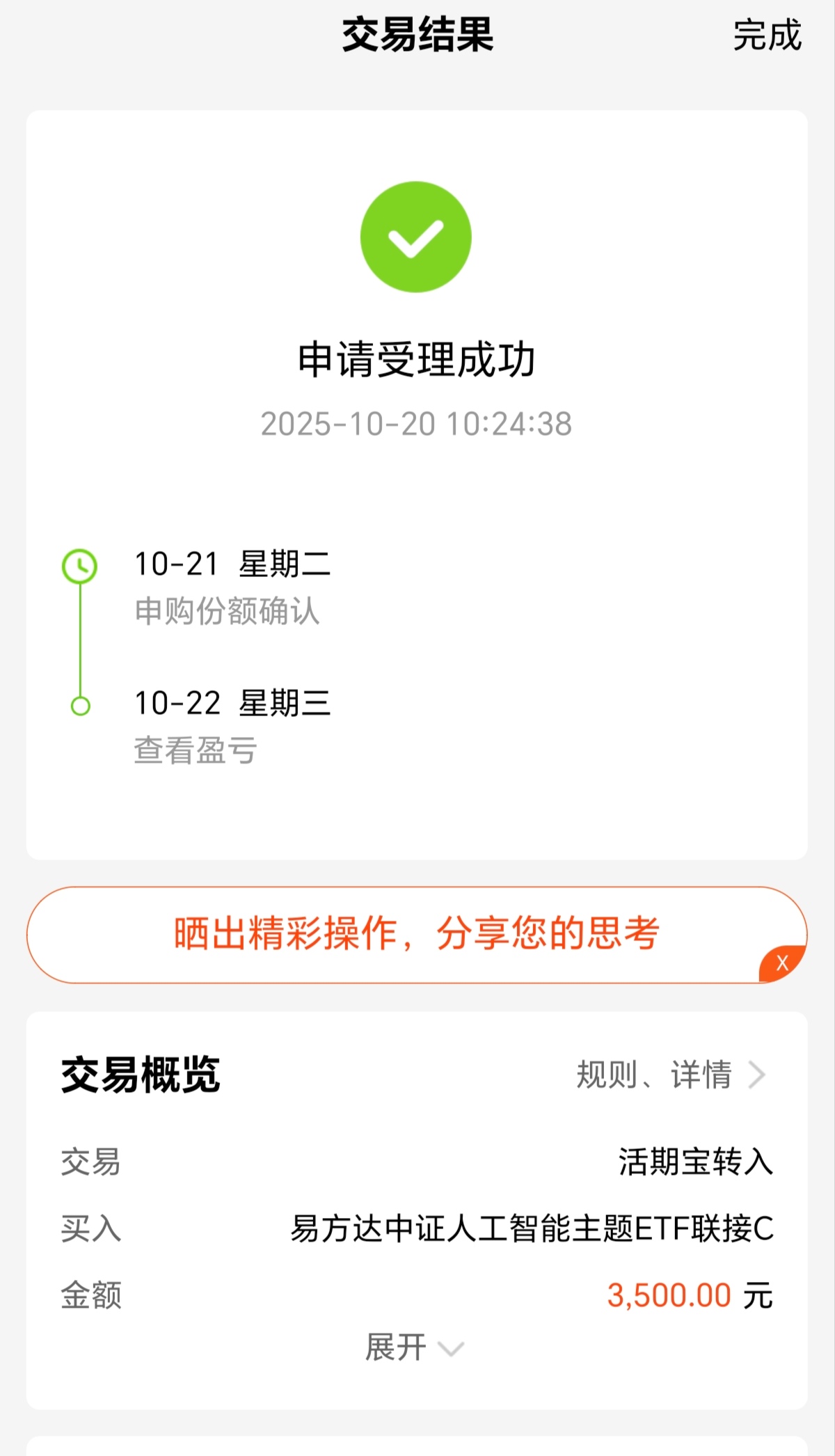 今日A股市场行情迎来全面回暖,人工智能更是迎来大反弹,同时之前短期带来的恐慌基本已经结束,期待后期再创新高度,不过当下热点繁多,细分板块容易选不准,我还是坚持定投$易方达中证人工智能主题ETF联接C(OTCFUND|012734)$持仓覆盖了人工智能全产业链,目前估值涨幅高达4%,看其当下上涨动力十足,我觉得后期行情仍然值得可观,期待接下来的反弹收获啦!
