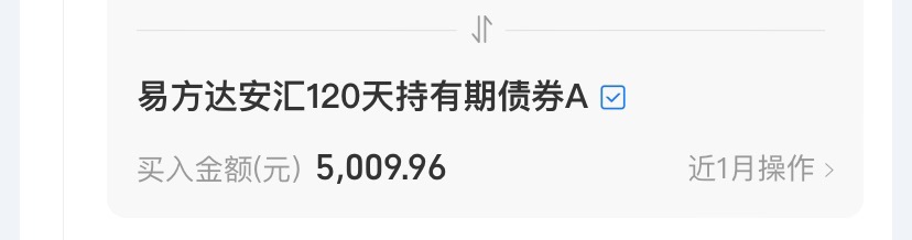$易方达安汇120天持有债券A$ 大侠今日加仓5000元,为稳健投资添砖加瓦。今年债市暖阳与骤雨交织,这只基金近一年收288个蛋,业绩亮眼。当权益市场波动、利率曲线摇摆时,安汇以0.11%的年度回撤展现稳健功力,持仓结构匠心独运:信用债占比超百成筑牢安全垫,利率债占比5.22%稳如磐石,现金储备0.29%细水长流。大侠深知,投资路上频繁调仓事倍功半,而安汇的“静水流深”恰是穿越周期的智慧之选。此番继续加仓,大侠作为稳健基石,期待后续多多收蛋。