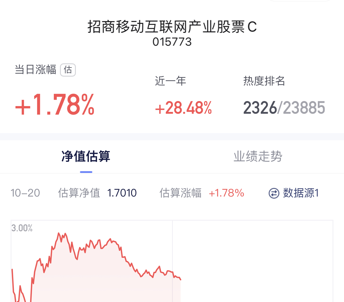 $招商移动互联网产业股票基金C(OTCFUND|015773)$目前估值上涨1.78%,近一个月上涨2.70%。