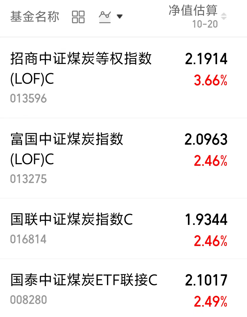 大盘回暖上涨,三大指数集体上涨,大科技等板块今天表现不错,煤炭今天大涨,来看看今天估值!$招商中证煤炭等权指数(LOF)C(OTCFUND|013596)$今天预估涨幅3.66%