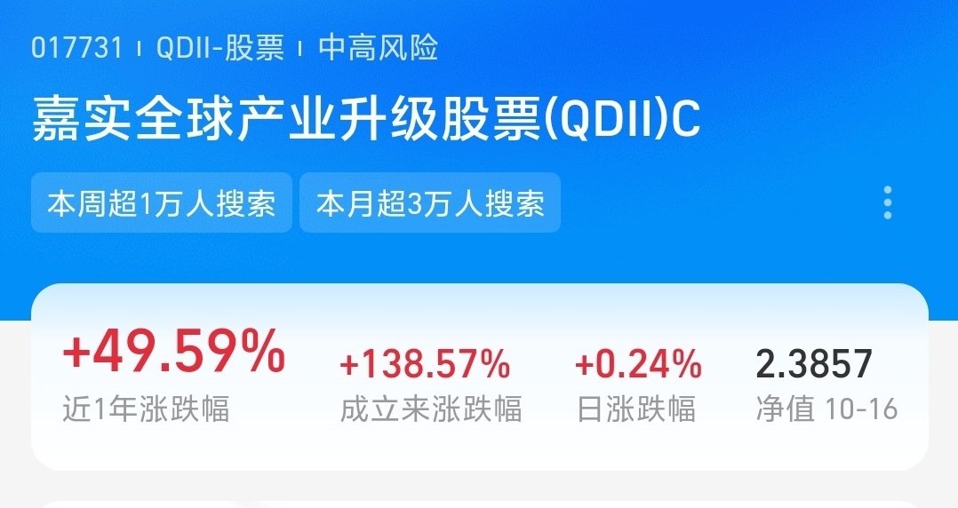 近期全球市场热点聚焦产业升级,AI算力、半导体等科技赛道持续发力,叠加新兴市场制造业崛起,具备全球视野的投资品更受青睐。我关注的嘉实全球产业升级股票(QDII)C表现亮眼,近一年涨幅达49.59%,其超9成仓位布局信息技术领域,精准捕捉全球科技成长红利,实力突出。