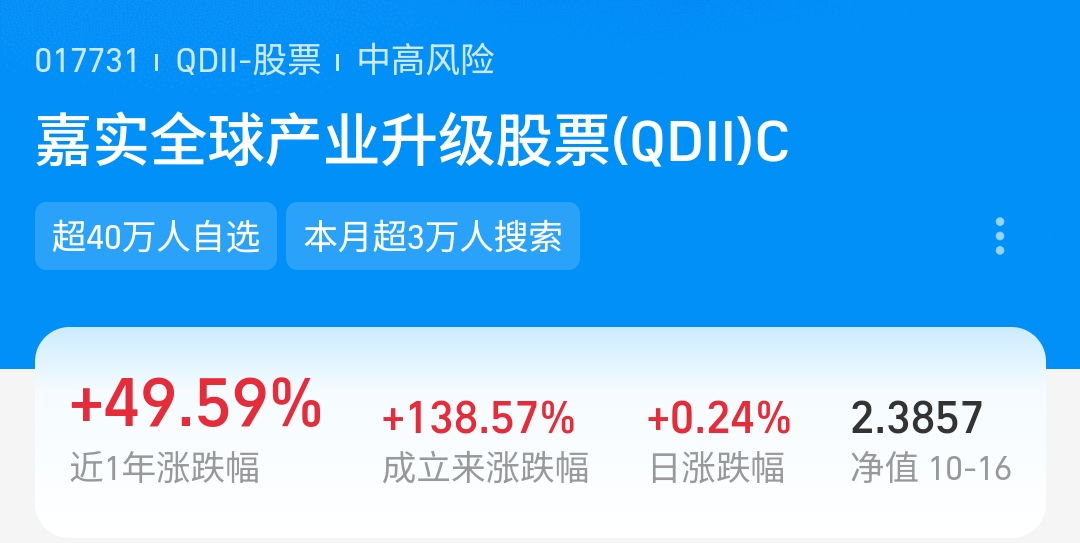 $嘉实全球产业升级股票发起式(QDII)C$ 近一年实打实涨了49.59%,上周五行情里也涨0.24%,业绩稳得住。布局全球科技最怕踩错节奏,但它方向抓得准,波动时也够稳,长期拿着踏实