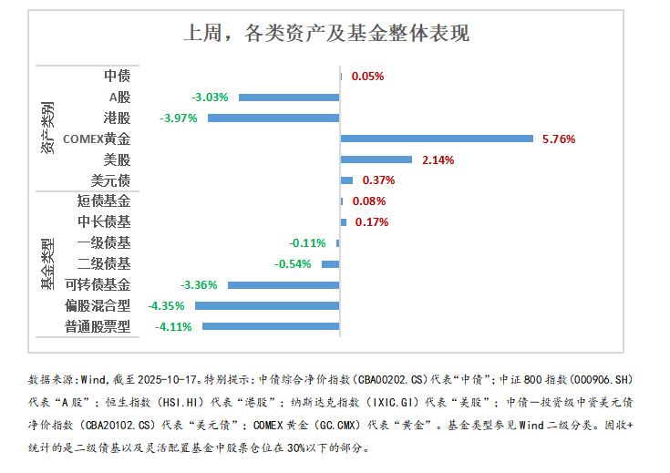 资产方面, 中债(0.05%)上涨,A股(-3.03%)、港股(-3.97%)下跌,黄金(5.76%)上涨,美股(2.14%)上涨,美债(0.37%)上涨。