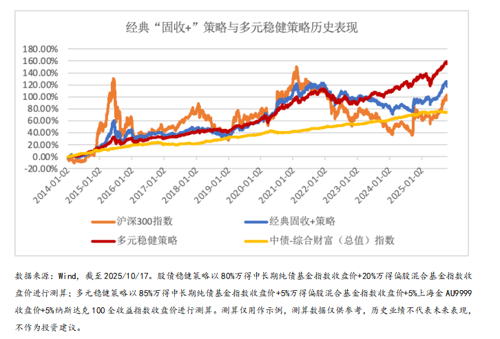 历史回溯来看,截至2025/10/17,经典固收+策略与多元稳健策略长期表现均优于纯权益或纯债券策略。