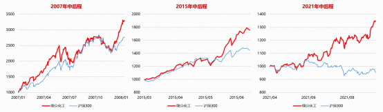 从历次行业上行阶段表现上看,细分化工指数远远跑赢大盘,且在中后程发力明显。在2007年、2015年和2021年的阶段行情中,细分化工指数相对沪深300超额收益分别为53%、33%、41%。