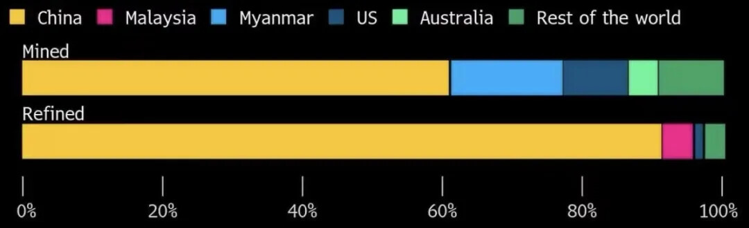 图表2:中国占据全球大部分稀土开采和精炼产能