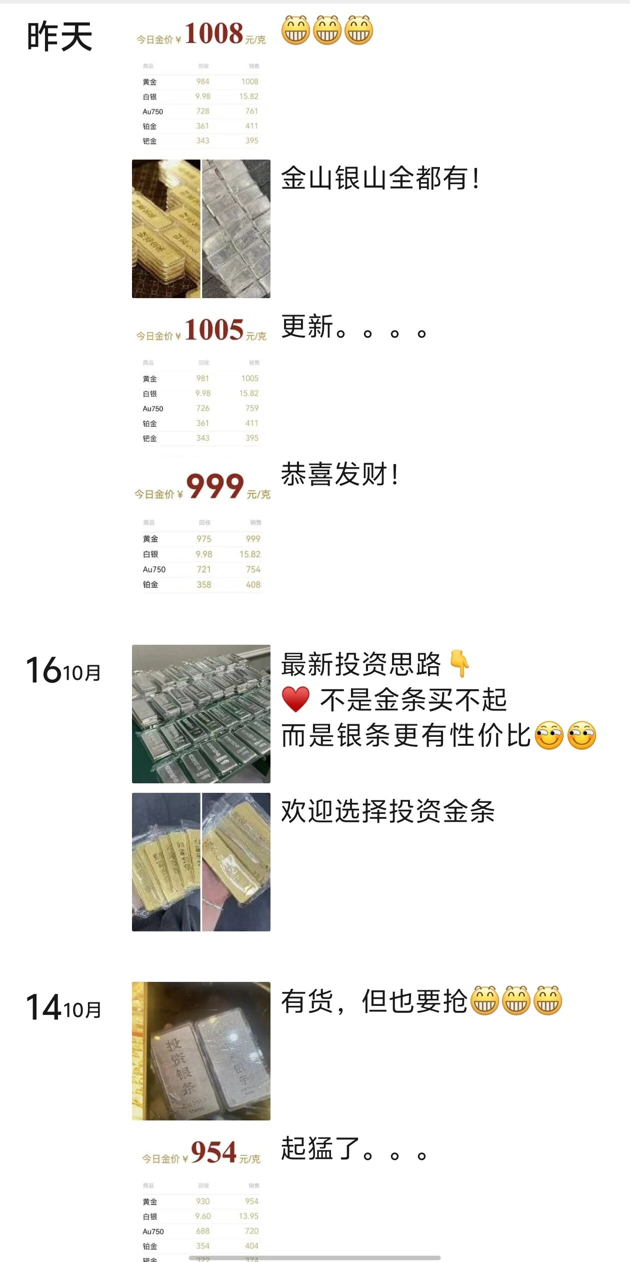 现在金饰价格一天一个价,我加了个金店老板,每天发价格变动,确实夸张。去年去逛金店的时候,金饰价格也就是600到700多左右,现在金饰价格已经突破了1000元。