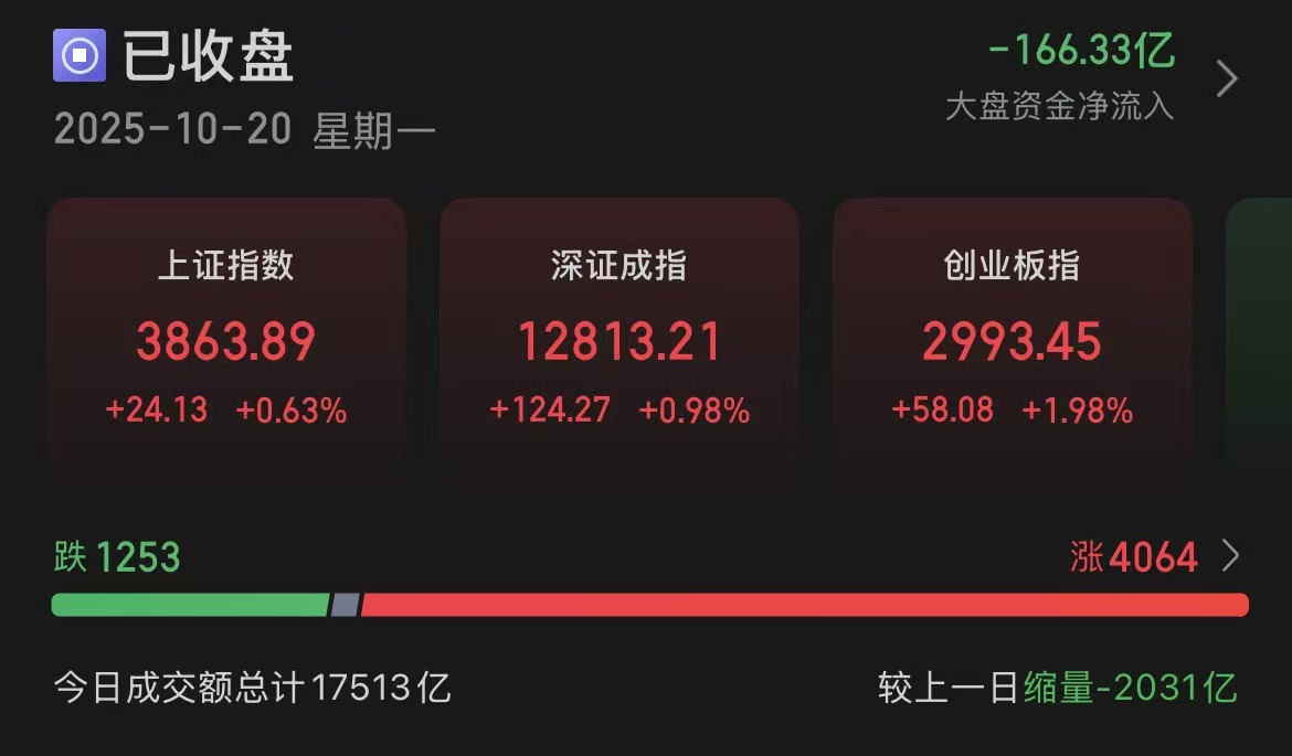 指数表现,沪指上涨0.63%,深成指上涨0.98%,创业板指上涨1.98%。个股涨多跌少,全市场4064只个股上涨,下跌个股1253只。沪深京市场全天成交额1.75万亿,较上个交易日缩量2031亿。