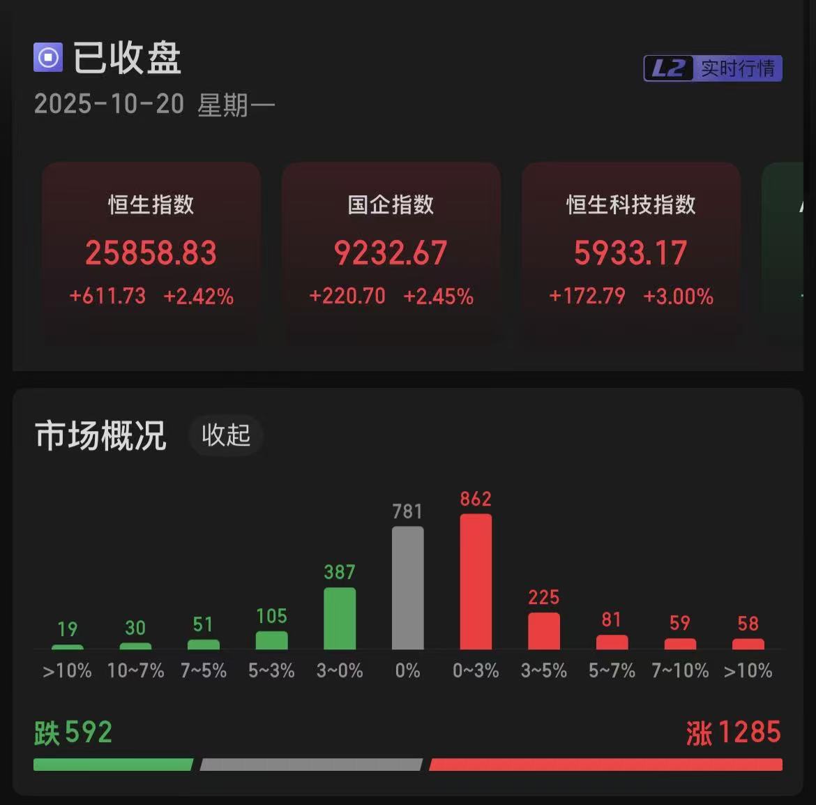恒生指数上涨2.42%,国企指数上涨2.45%,恒生科技指数上涨3.00%。1285只个股上涨,592只个股下跌。南向资金,净卖出26.70亿港元。