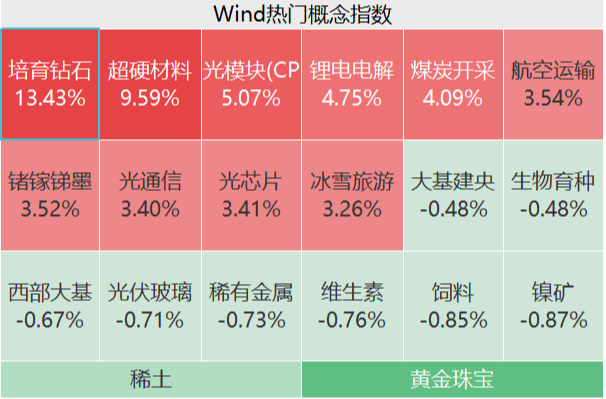 盘面上,热点轮番活跃,钻石培育、算力、锂电电解、煤炭等概念涨幅居前,黄金股大跌。如早盘分享,周末中美局面缓和后,市场风偏提升,AI科技方向重新走强。其中,人造钻石的上涨,主要交易其高端应用需求和钻石出口管制政策。据悉,人造钻石是目前给芯片最有效的散热材料之一。但自2025年11月8日起,中国对部分工业级人造钻石实施出口管制,而全球80%以上的人造钻石产能来自中国。中美谈判的筹码仍在增加。