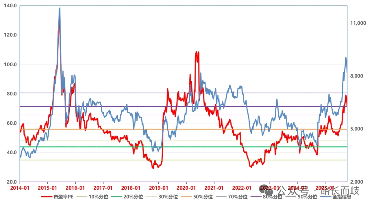 参考2014年至2016年牛熊转换周期,全指信息当前市盈率71.51,估值分位82.98%。