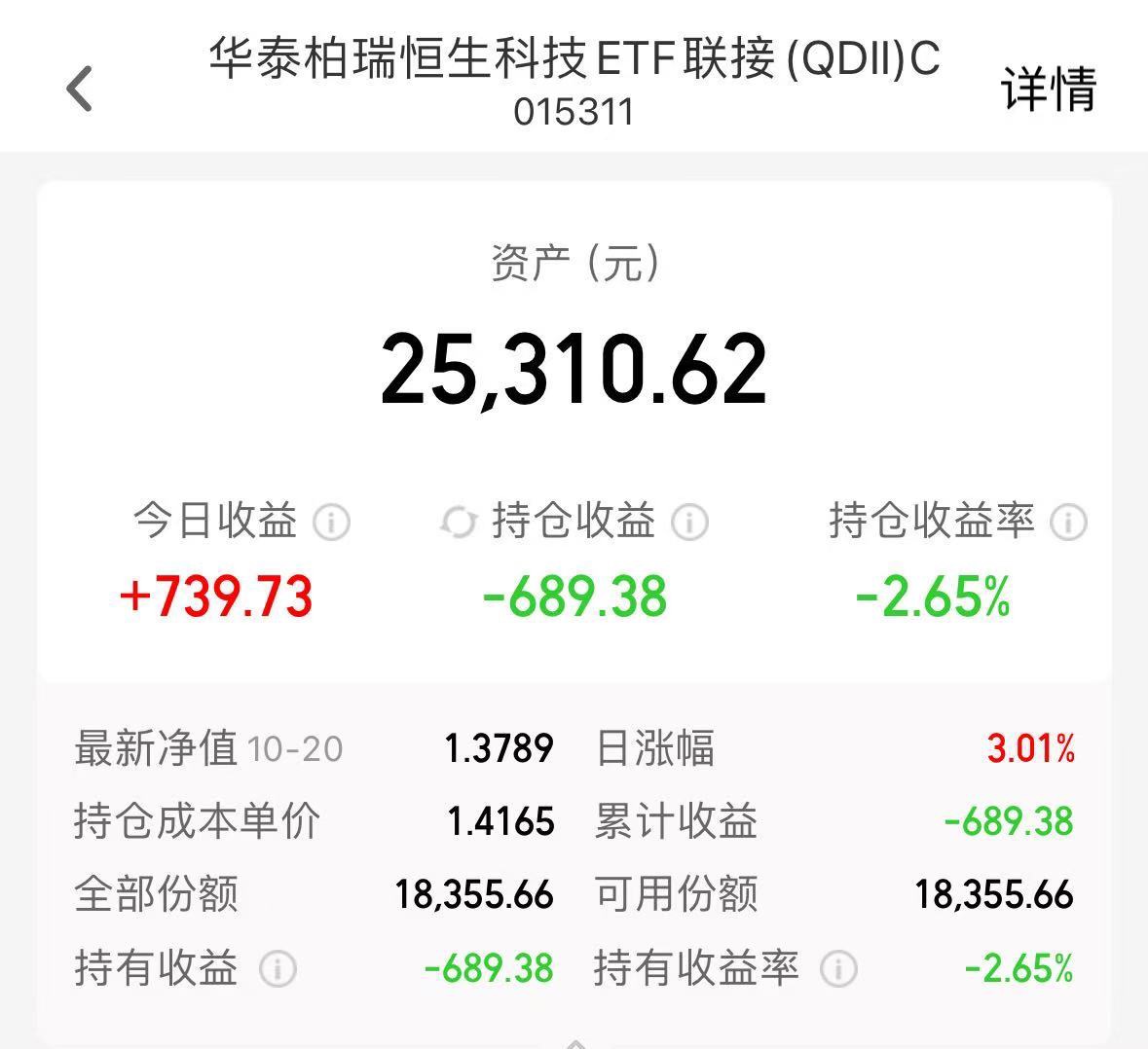 恒生科技今天回血很多,最近跌到比较多,但是我们通过分批买入华泰柏瑞这只,目前亏不到2个点,这只我属于高位建仓,另外两只天弘和易方达我都是低位建仓,虽然华泰这只高位建仓,但是离回本还是很快,接下来我的思路还是逢低加仓,恒生科技现在估值很低,未来空间也更大