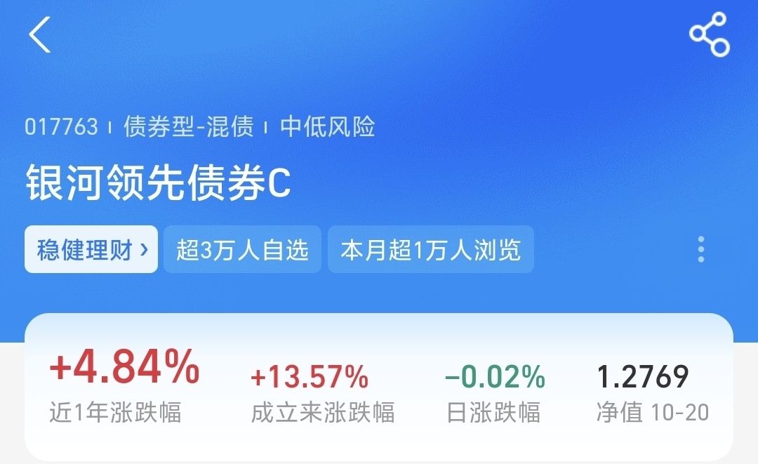 $银河领先债券C$ 近一年的涨幅有4.84%,近三年收益都挺稳的,眼下股市和债市都不稳定,来回波动,相比之下这种中波“固收+”就显得稳多了,我也来看看。