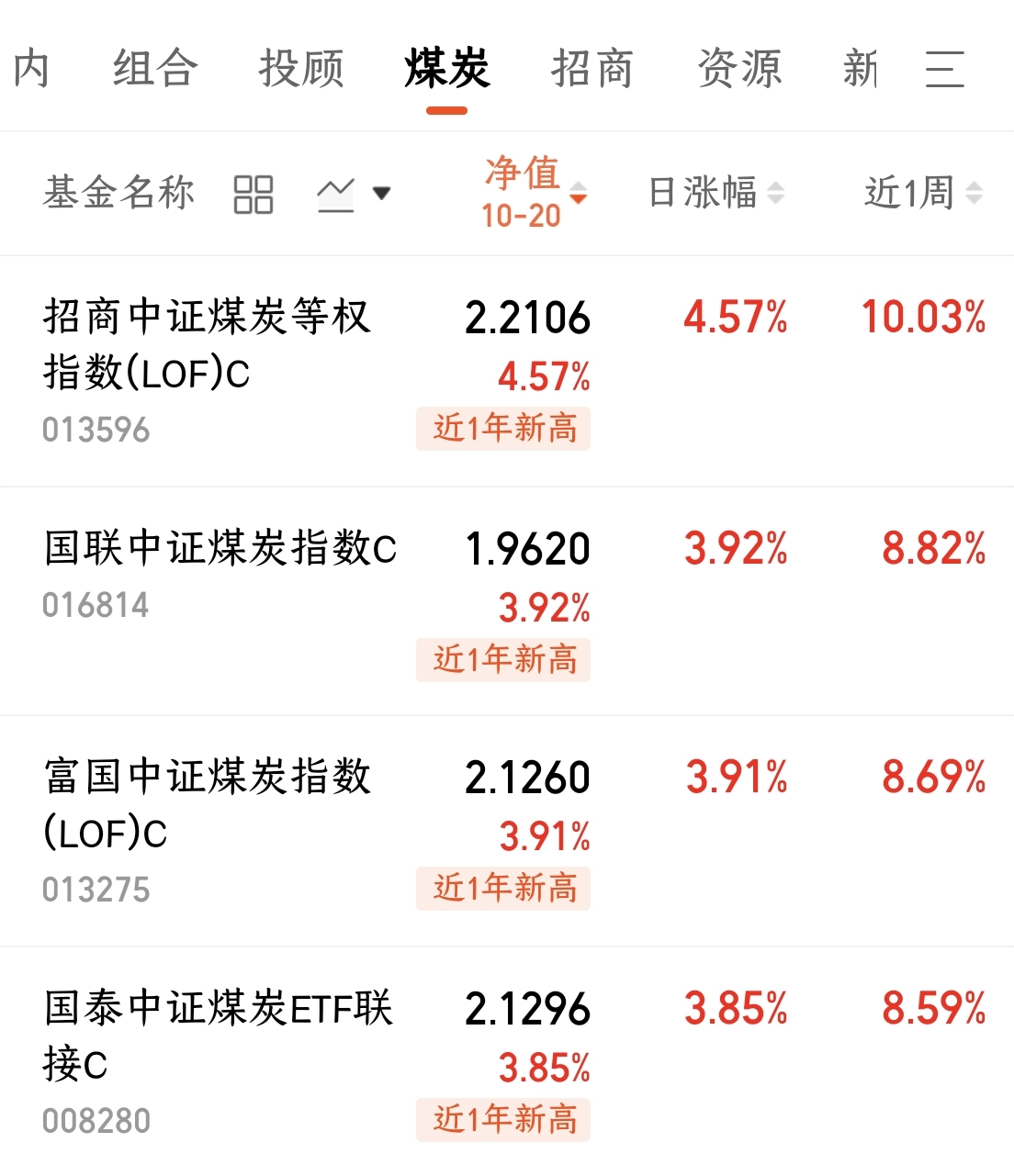 $招商中证煤炭等权指数(LOF)C(OTCFUND|013596)$昨日上涨4.57%,同类最高。