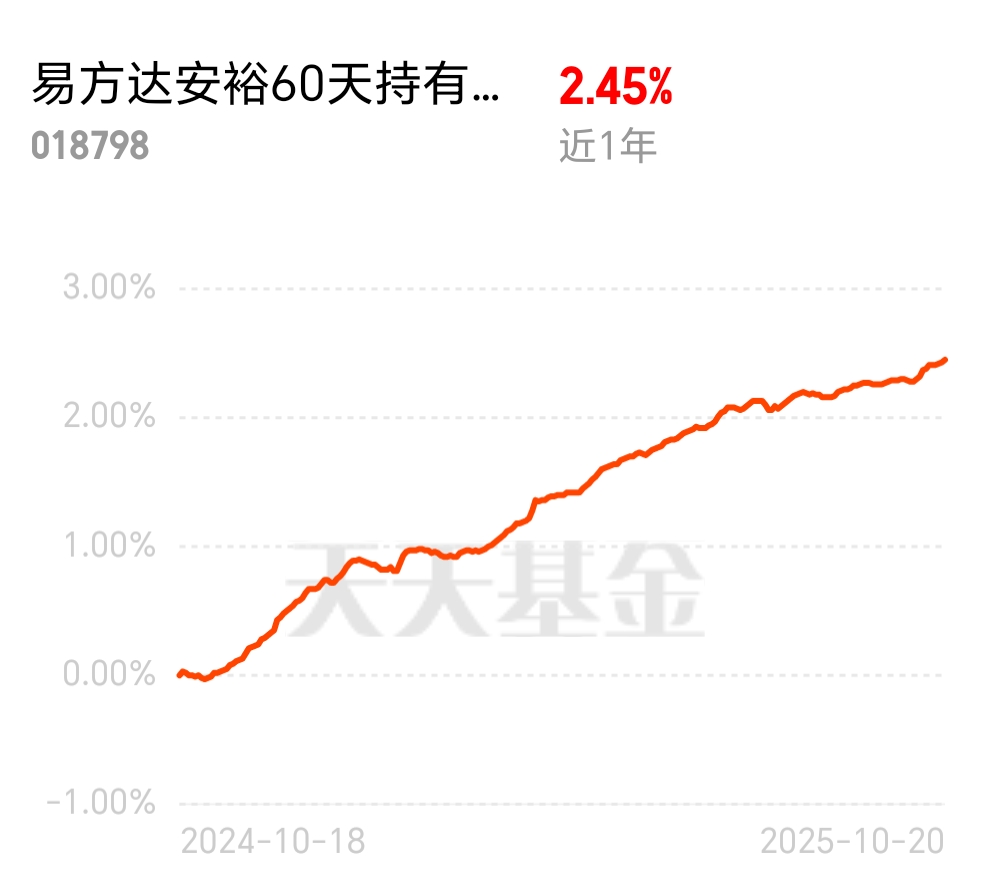 其实,最近纯债这百年信用债还算稳定,断断续续涨了一周了,放在安裕这里,就是图个安逸,跑赢银行存款就好。昨天纯债表现一般,但是安裕依然稳定发挥收蛋2个,近一年收益率2.45%,今年纯债行情这样的背景下,依然比五年定存还高一个点,而他的最大的回撤仅为0.09%,相当的巴适。最近隔壁震荡加剧,我继续往信用债挪,补仓易方达安裕5000块,让底仓更稳。