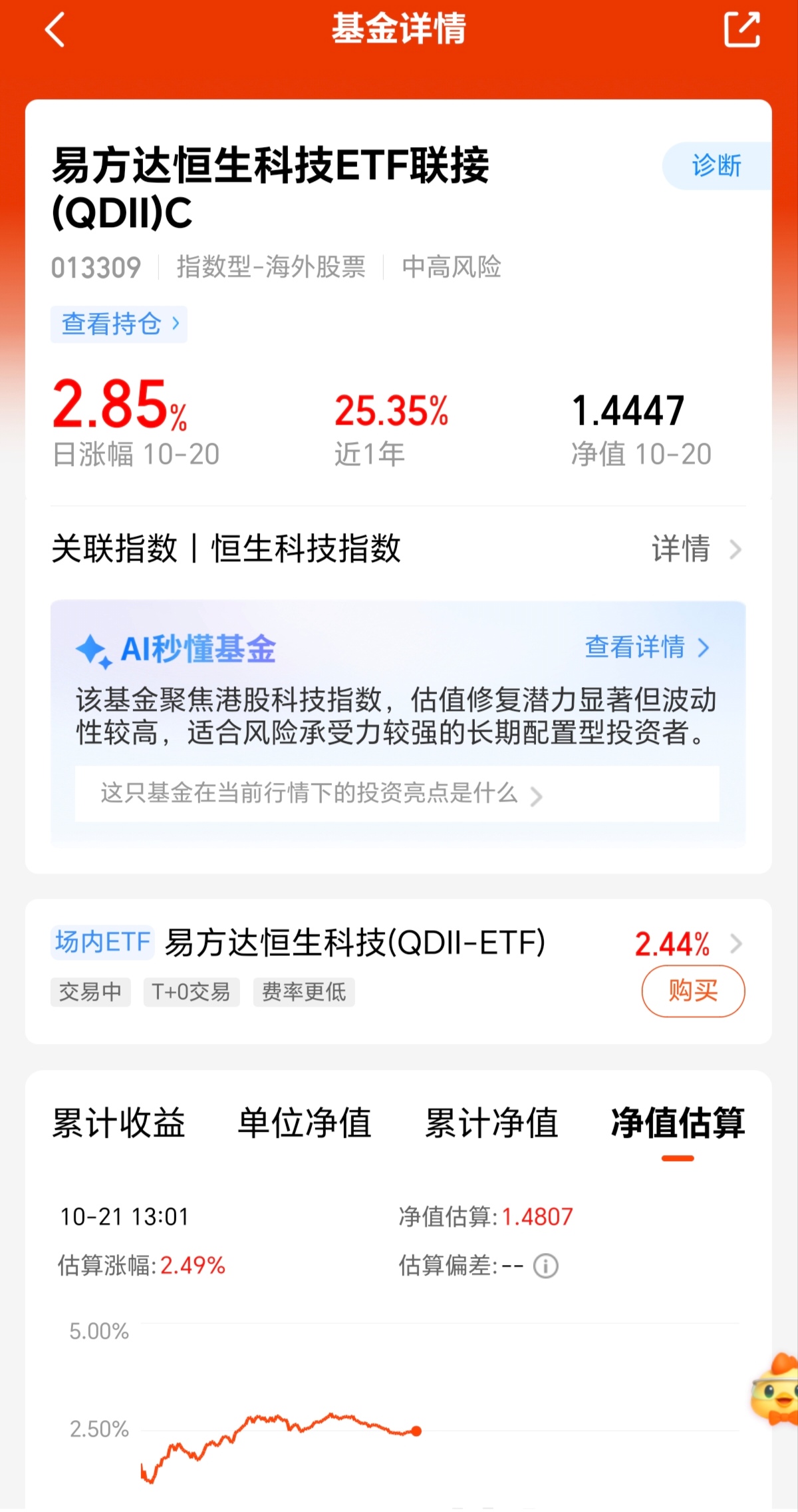 今日港股市场再迎反弹趋势,恒生科技赛道更是强势领涨,而从中长期来看,港股科技相比A股、美股估值都要更低,所以更具性价比,而我也准备继续定投$易方达恒生科技ETF联接(QDII)C(OTCFUND|013309)$紧密跟踪恒生科技指数,昨日大涨2.85%,稳稳跑赢同类产品,并且10月底降息基本已经确定,也将会再次利好港股科技,我也果断逢低加仓了!