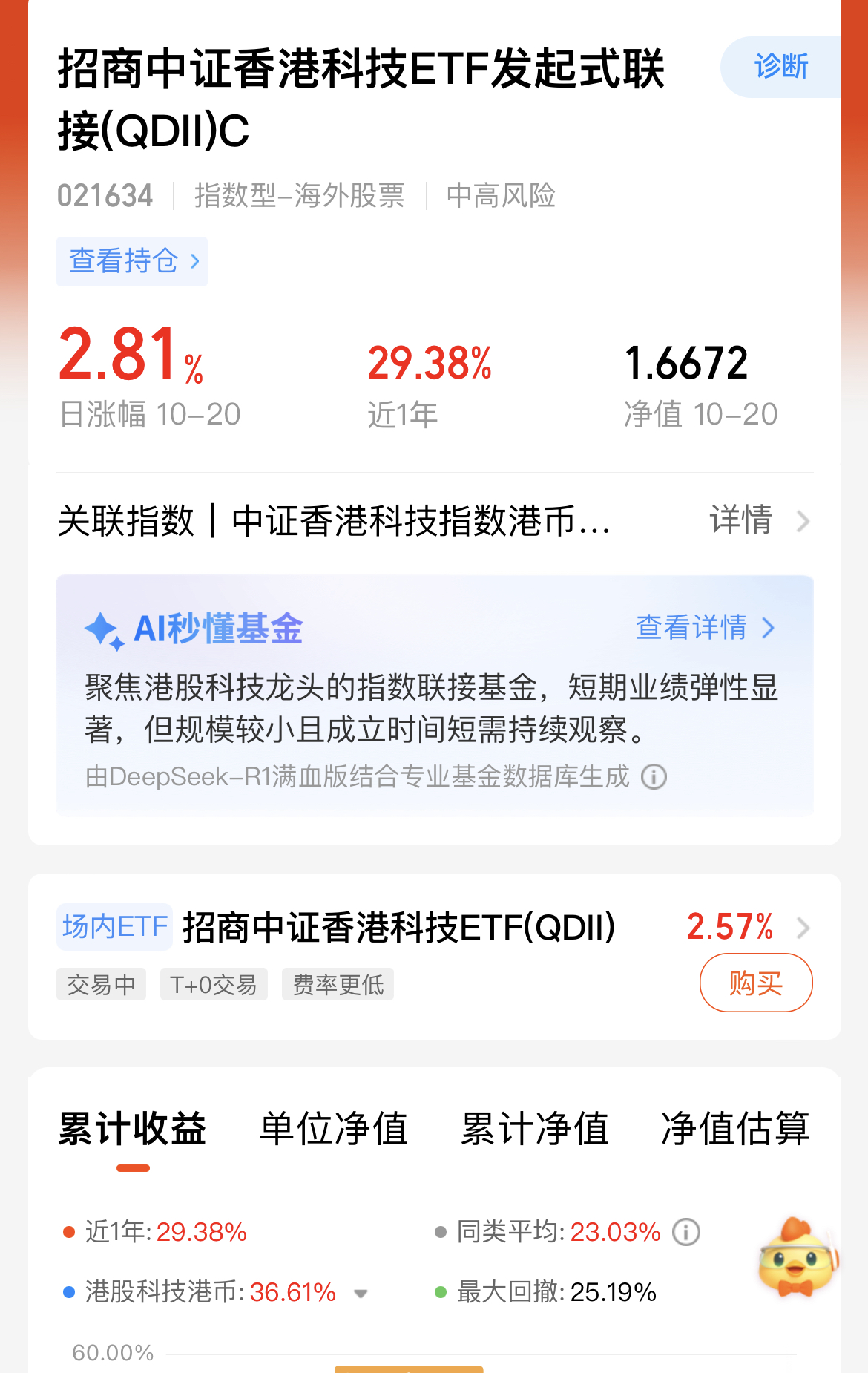 今天市场行情不错,大A和港股市场集体上涨,特别是港股科技,这两天涨幅不错,我手里的$招商中证香港科技ETF发起式联接(QDII)C(OTCFUND|021634)$昨日大涨近3个点,今天早盘又接着涨了2.56%,反弹势头很足,我打算趁机加仓。这只基金聚焦港股科技龙头,能精准捕捉板块机会,而港股科技估值仍具优势,且受AI催化、资金流入等利好支撑,后续修复空间可观。更省心的是,它免申购费,持有7天还免赎回费,成本低又灵活。现在跟着板块反弹加仓,正好能把握行情,性价比很高。