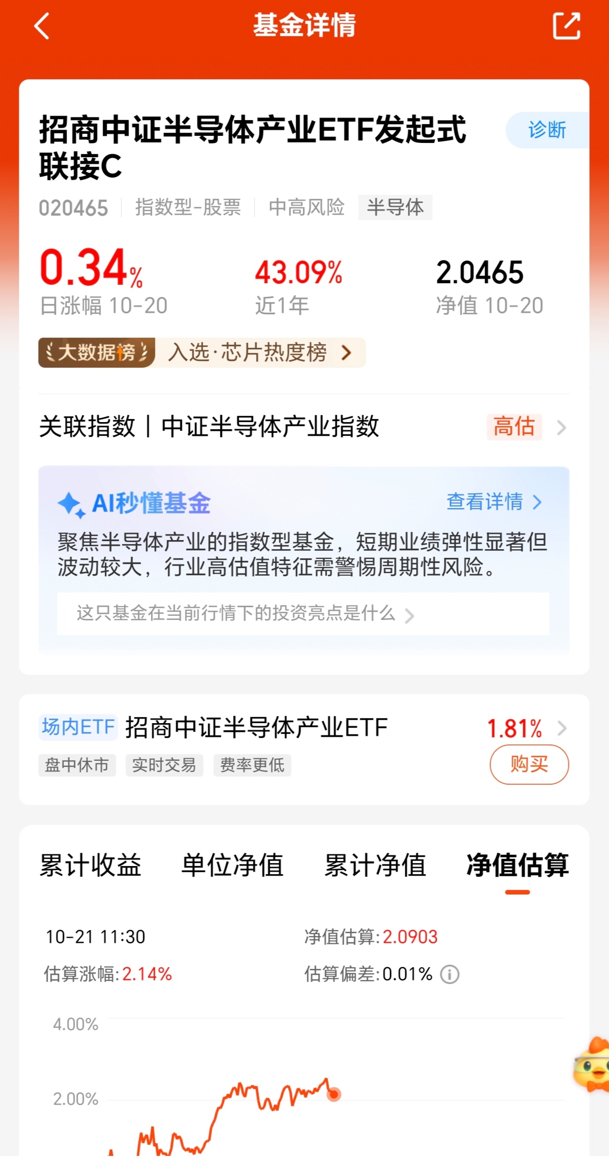 今日大盘行情一路高开高走,市场行情越发向好,而半导体赛道整体表现出色亮眼,以$招商中证半导体产业ETF发起式联接C(OTCFUND|020465)$来说,聚焦半导体全产业链,目前实时估值大涨2%,近三个月涨幅高达39.64%,业绩远远跑赢同类平均,并且从中长期逻辑来看,无论是产业催化,还是TMT三季报+十五五规划等利好催化,都将使半导体板块长期受益,而我也将长期看好这一赛道!