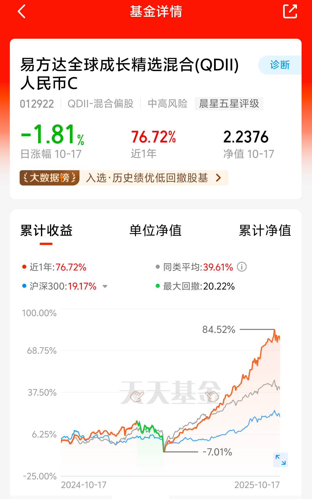 大盘今天表现不错,继续上涨,科技板块整体涨了不少,港科技今天表现也很不错,近期回暖反弹,美股也涨起来了!单一市场风险大,多元化投资可以降低风险,易方达全球成长精选混合C持仓可投全球科技板块,美股、港股和A股都能投,近一年涨了76.72%,还是历史绩优低回撤榜一,能涨抗跌,看走势挺稳的,我准备分批加仓了!