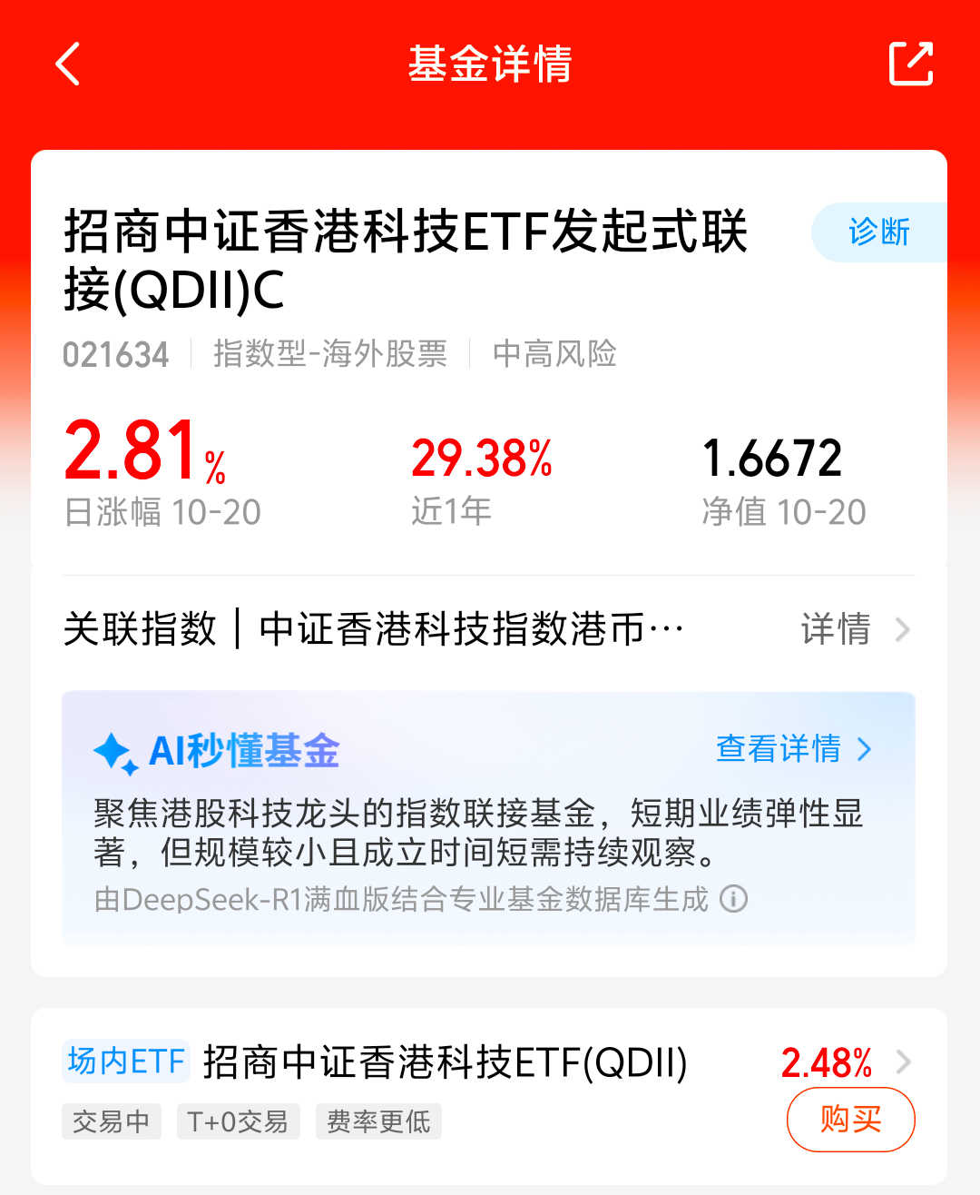 港科技昨天涨了接近三个点,今天继续上涨,早盘涨了2个点!近期南向资金持续流入港股,港股科技板块相对来说仍处于低位,发展空间还很大,$招商中证香港科技ETF发起式联接(QDII)C(OTCFUND|021634)$昨天涨了2.81%,近六个月涨了20.17%,看好这个方向,我准备分批加仓了!