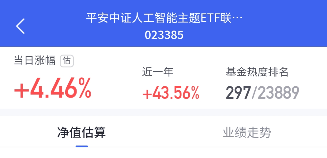 科技方向全线上涨,今天这个大盘放量上涨的趋势,目前这个人工智能方向也是领涨的趋势$平安中证人工智 能主题ETF联接C$ 目前预估涨4.46%,近一年涨了43.56%,今天也是吃肉了啊!